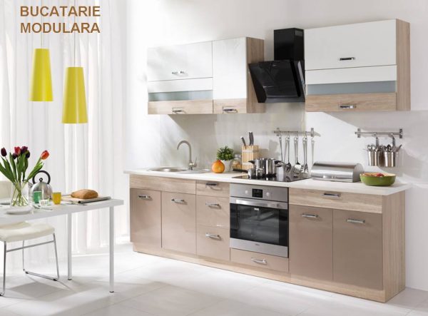 Culori corpuri sonoma , usile o combinatie de mdf capucino lucios si sonoma mat. In general, bucataria este cel mai imporatant spatiu dintr-un camin, este locul magic unde se reuneste familia pentru a lua masa impreuna dupa o zi lunga.
