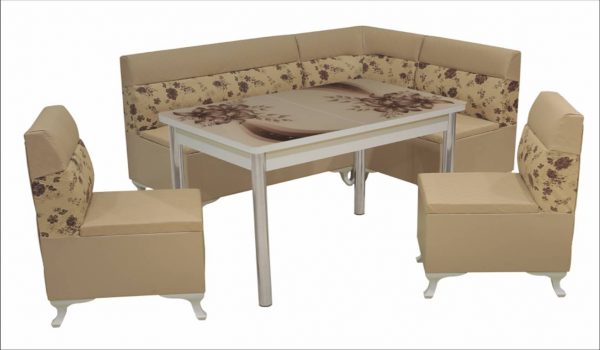 Coltar de bucatarie cu doua banchete si masa extensibila cu blat de sticla printata si securizata.
