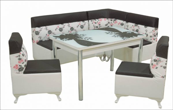 Coltar de bucatarie cu doua banchete si masa extensibila cu blat de sticla printata si securizata.